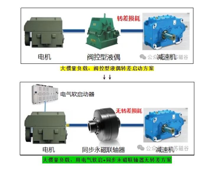 風機水泵平方轉矩類用液力偶合器或渦流永磁調速器調速,電機功率1000kW,調速比i=80%,轉差損耗功率= (80%^2 - 80%^3)*1000 = 63.5kW;按年工作8000小時,電費0.6元/度計算,年耗電費=63.5*8000*0.6=304800(元) 據估算,(1) 用于緩沖沖擊保護配套有阻尼類緩沖液力偶合器每年轉差損耗為478億千瓦時;(2) 用于風機、水泵負載轉差調速過程每年產生的轉差損耗為560億千瓦時;合計轉差損耗478+560=1038億千瓦時,占比2022年中國工業領域電機總用電量3.98萬億千瓦時2.68%。相當三峽發電全年的發電總量。 【解決緩沖轉差損耗策略1】 中小轉動慣量負載優先采用無轉差彈性緩沖方式啟動和運行。