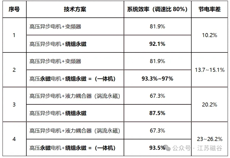 【繞組永磁調速高節電性能】 繞組永磁調速的原理就是將發熱轉差功率用永磁轉差發電技術來回收轉差能量。繞組永磁調速具有高節電性能:永磁一體就是將永磁電機和繞組永磁調速器嵌套集成的雙永磁調速電機。 1)繞組永磁調速同工況取代液力偶合調速器節電率見下表: